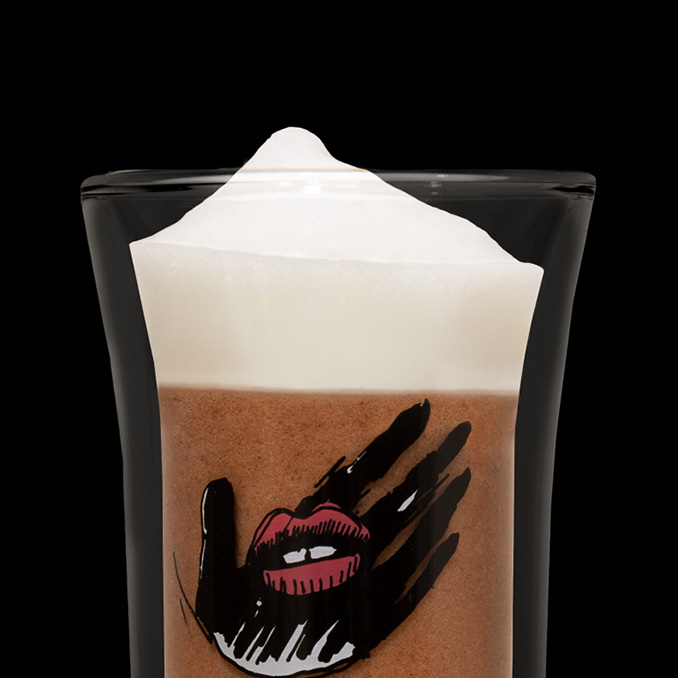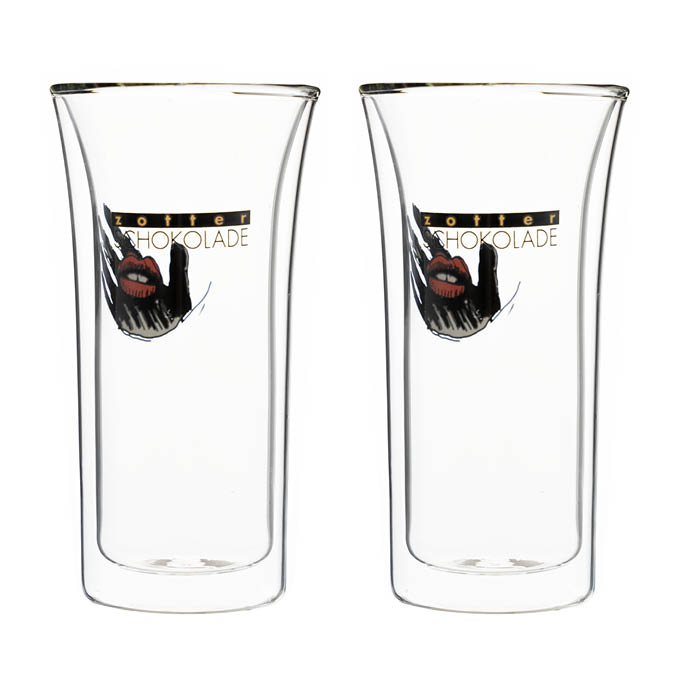 Das doppelwandige Trinkschokolade-Glas wirkt schlank und filigran. Durch die doppelte Glaswand scheint die Trinkschokolade zu schweben und außerdem verbrennt man sich auch nicht die Finger. Mit einer Grafik von Andreas h. Gratze.